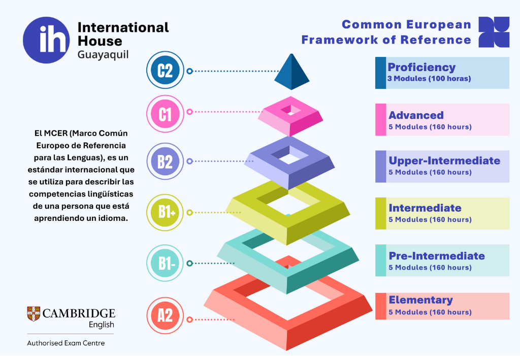 En International House Ecuador nos guiamos por el Marco Común Europeo de Referencia para Idiomas (CEFRL), estándar que establece una serie de niveles para todos los idiomas, a partir de los cuales se facilita la homologación de títulos emitidos por las entidades certificadas, en este caso por la Universidad de Cambridge. Nuestros profesores emplean metodología de la Universidad de Cambridge para impartir clases dinámicas enfocándose en comunicación significativa dentro del salón de clases.
